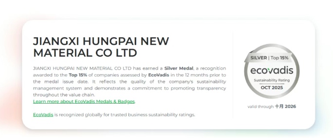 【色母粒产业网】12月19日消息,近期,江西宏柏新材料股份有限公司(以下简称宏柏新材)在企业社会责任领域成绩斐然,成功荣获EcoVadis银牌评级,总分达到74分,这一综合评分超越了全球90%参与评估的企业。