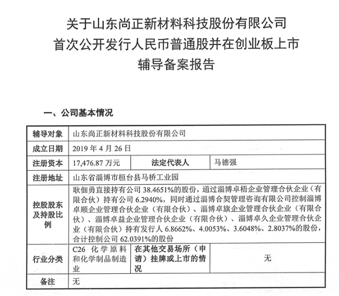 山东尚正新材于2019年4月正式成立,注册资本达1.75亿元人民币,注册地位于山东省淄博市。公司扎根于淄博市桓台县马桥工业园,专注于化学原料和化学制品制造领域。值得一提的是,该公司曾积极参与淄博市2021年与2023年的重大项目建设,其聚氨酯新材料及配套产品建设项目更是被列为市重点产业项目,展现出强劲的发展势头。在股权结构方面,耿佃勇作为控股股东,直接持有公司38.4651%的股份,并通过淄博卓梧企业管理合伙企业(有限合伙)间接持有6.2940%的股份。此外,他还通过淄博合契管理咨询有限公司控制多家企业管理合伙企业,合计控制公司62.0391%的股份,彰显出稳固的股权控制力。