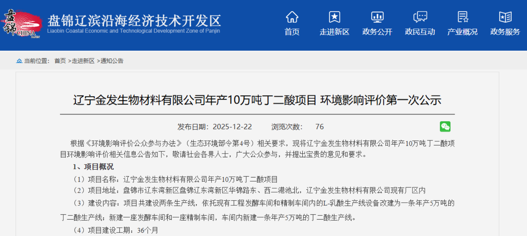 【色母粒产业网】12月26日消息,12月22日,盘锦辽滨沿海经济技术开发区发布消息,辽宁金发生物材料有限公司的年产10万吨生物基丁二酸项目正式开启环评公示流程。