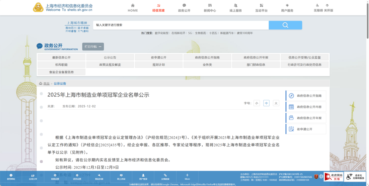 【色母粒产业网】12 月 30 日消息,上海市经济和信息化委员会官网近日正式对外发布 2025 年上海市制造业单项冠军企业名单,共有 97 家企业成功跻身榜单。此次名单的公布,核心目的在于表彰那些长期深耕制造业细分赛道、手握国际领先技术、占据全球前列市场份额的标杆企业,充分彰显了上海着力培育具有全球影响力企业群体、扎实推进实体经济振兴的坚定决心。