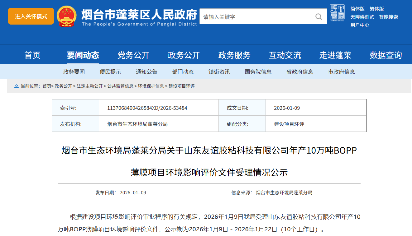 2026年1月9日烟台市生态环境局蓬莱分局受理山东友谊胶粘科技有限公司年产10万吨BOPP薄膜项目环境影响评价文件。