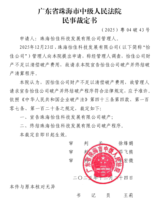 2025年12月23日,珠海怡佳科技发展有限公司(以下简称"怡佳公司")管理人向本院提出申请,称经管理人调查,怡佳公司财产不足以清偿破产费用,故请求本院宣告怡佳公司破产并终结破产清算程序。
