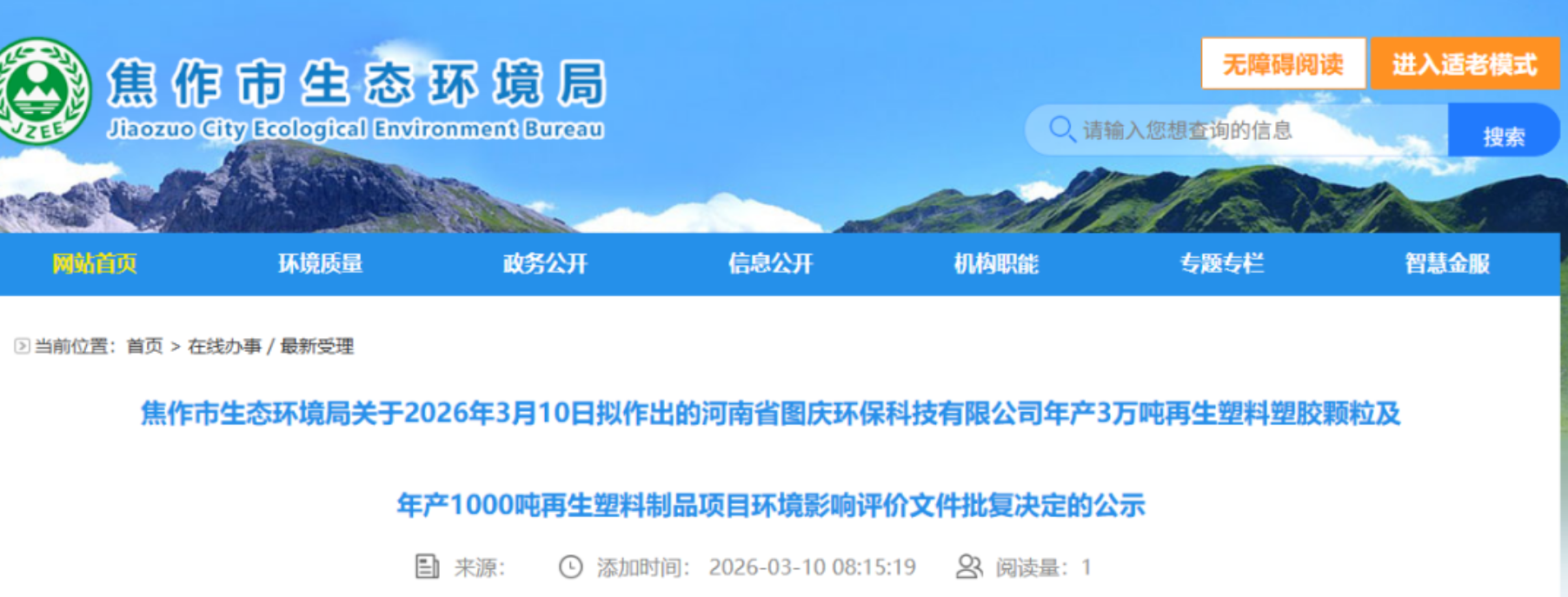 【色母粒产业网】3月18日消息,3月10日,焦作市生态环境局对外公示了拟作出的建设项目环境影响评价文件批复决定,项目为河南省图庆环保科技有限公司年产3万吨再生塑料塑胶颗粒及1000吨再生塑料制品项目。