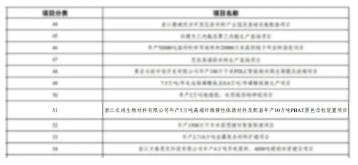 其中,浙江长鸿生物材料有限公司年产5万吨高端纤维弹性体新材料及配套年产10万吨PBAT黑色母粒装置项目入选。