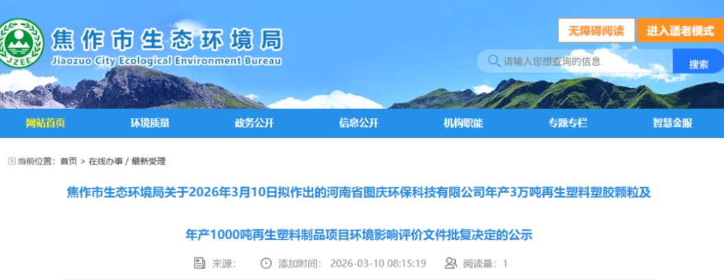 【色母粒产业网】3月30日消息,3月10日,焦作市生态环境局对外公示了拟作出的建设项目环境影响评价文件批复决定,河南省图庆环保科技有限公司的年产3万吨再生塑料塑胶颗粒及年产1000吨再生塑料制品项目,其环评文件有望获得批复。