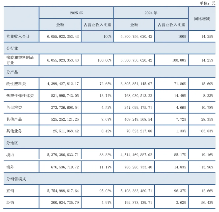 改性塑料板块营收43.99亿元(同比+15.60%),为核心支柱,色母粒板块营收2.74亿元(同比+10.78%)。
