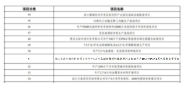 其中,浙江长鸿生物材料有限公司年产5万吨高端纤维弹性体新材料及配套年产10万吨PBAT黑色母粒装置项目入选。