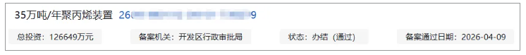 项目总投资12.66亿元,设计年产35万吨/年聚丙烯本色粒料。