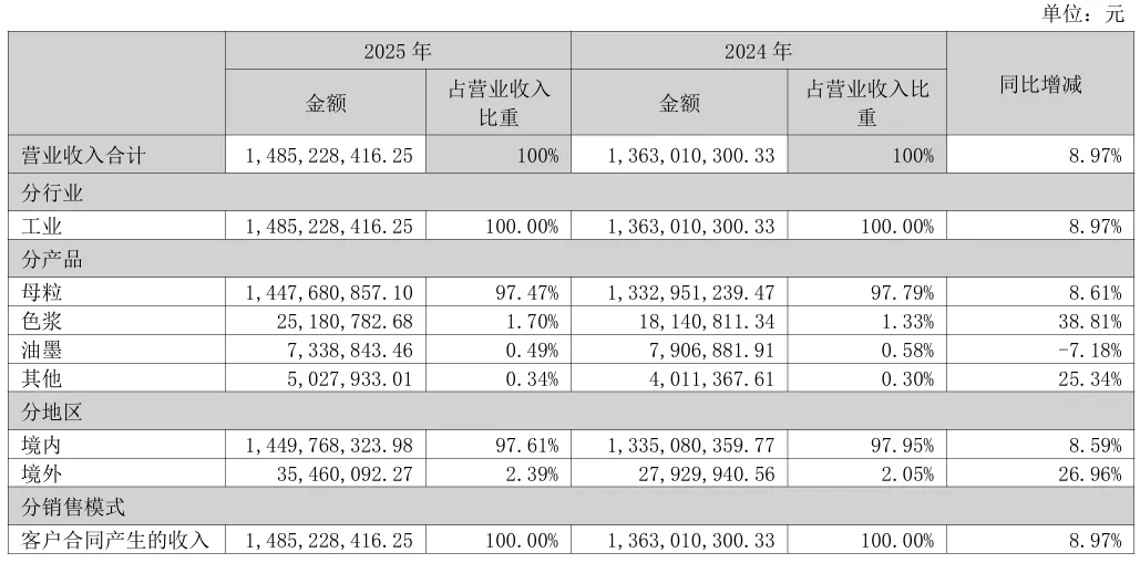 分产品来看,核心产品母粒实现销售收入14.48亿元,占总营收比重达97.47%,毛利率21.26%,产品结构高度集中且盈利稳定。